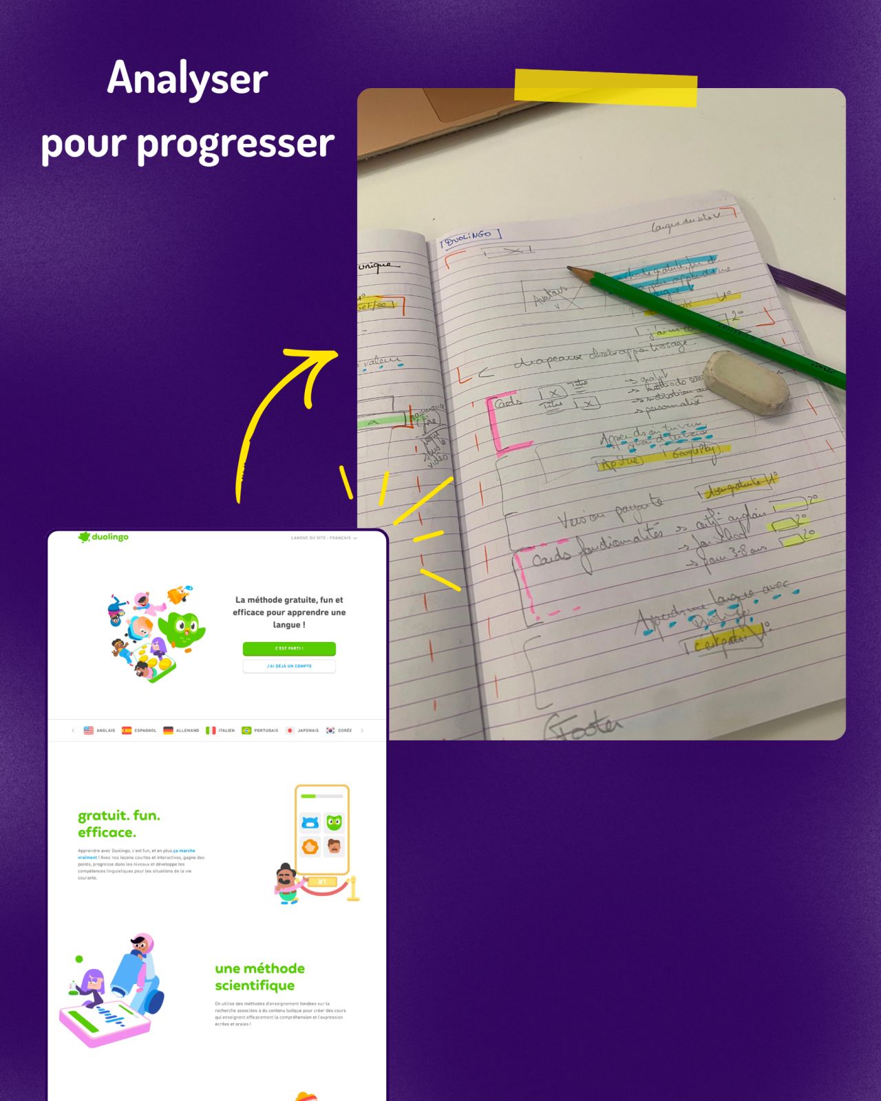 Comment je progresse en design ? 2h par semaine à décortiquer ce qui fonctionne. 1 écran, 1 carnet, 1 crayon → c’est parti. 👀 Analyser des données ? Je sais faire. Créer une maquette ? Idem. Structurer une landing page pour la conversion ? …eww. C’est mon sujet du moment. Alors vendredi, j’ai analysé 4 pages de vente : Duolingo, Notion, Framer et Alan. Ma méthode en 3 étapes : 1 - OBSERVER = Schématiser la structure → Au dessus de la ligne de flottaison (ce qui est visible à l’ouverture de la page) : Type de menu · Formulation de la valeur · CTA · Incitation au scroll → Au scroll : Sujet, objectif et organisation des section · Présentation du contenu (cards, accordéon, visuels,…) 2 - COMPRENDRE = Analyser les patterns → Quels CTA reviennent d’une marque à l’autre ? → Quels schémas se répètent ? → Qu’est ce qui diffère selon le produit ou la cible ? → Comment la valeur est-elle mise en avant ? 3 - ESSAYER = Mettre en pratique Pour appliquer, je choisis un produit au hasard. Vendredi dernier : un logiciel de management intégré QSE (mon ancienne vie pro laisse des traces) : → J’imagine une proposition de valeur → Je définis le contenu dans les grandes lignes → Je schématise la structure jusqu’au zoning papier Objectif annexe : obtenir un squelette réutilisable pour mes futures sessions UI. Mon but n’est pas la perfection mais la progression, session après session. Observer → Comprendre → Essayer → Recommencer Factuellement et rapidement, sans me perdre dans les détails. Parce que pratiquer de façon délibérée = progresser 💡